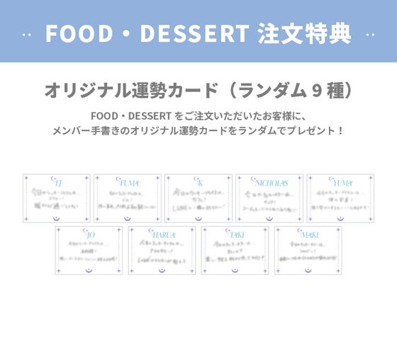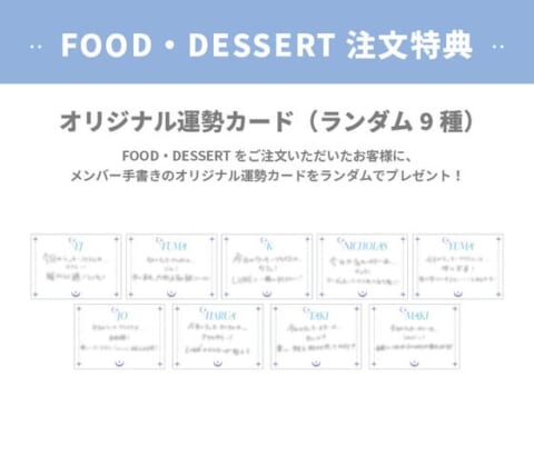 フードまたはデザートメニューを1品注文ごとに「オリジナル運勢カード(全9種)」がランダムで1枚プレゼントされます。