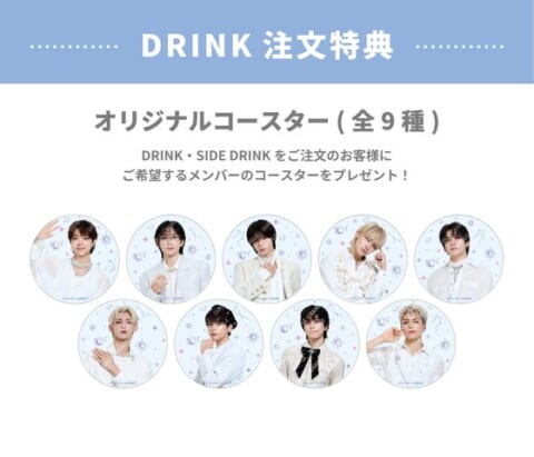 ドリンクメニューを1品注文ごとに、希望するメンバーの「オリジナルコースター(全9種)」が1枚プレゼントされます。