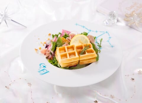 ふんわりとしたワッフルにクリームチーズを重ねたサラダプレートです。対象メンバーはEJです。