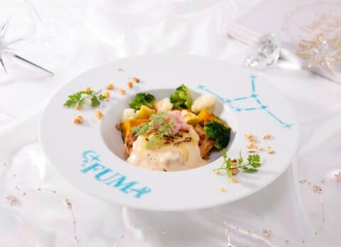 かにをトッピングし、かぼちゃやさつまいもなどを使用したラザニアです。FUMA、NICHOLAS、JOからお好きなメンバーを選べます。