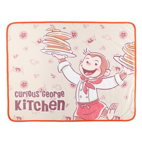 コックコート姿の大きなジョージがデザインされたブランケットは、Curious George Kitchenならではのアイテムです。もこもことした心地よい肌触りが特徴で、部屋やオフィスでの使用はもちろん、ベビーカーに乗せるなど様々なシーンで活躍します。
