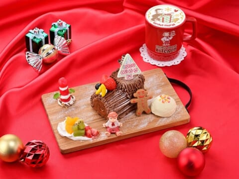 チョコレートホイップをまとったカスタードのロールケーキは、テレビアニメシリーズ『おさるのジョージ』に登場するゆきだるまをイメージしたチェリーやジンジャークッキー、ツリー形のカレンダーなどのモチーフをあしらった一品です。ジョージと一緒にクリスマスまでのカウントダウンを楽しむような、遊び心溢れるデザインが特徴です。本メニューには、ジョージの陶器マスコットが付属します。