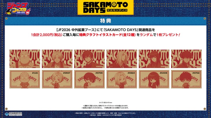 中外鉱業ブースにてTVアニメ『SAKAMOTO DAYS』JF2026関連商品を1会計2,000円(税込)ご購入毎に、特典クラフトイラストカード(全12種)をランダムで1枚お渡しします。この特典は、ECサイト「Chugaionline」で通販購入された方も対象です。