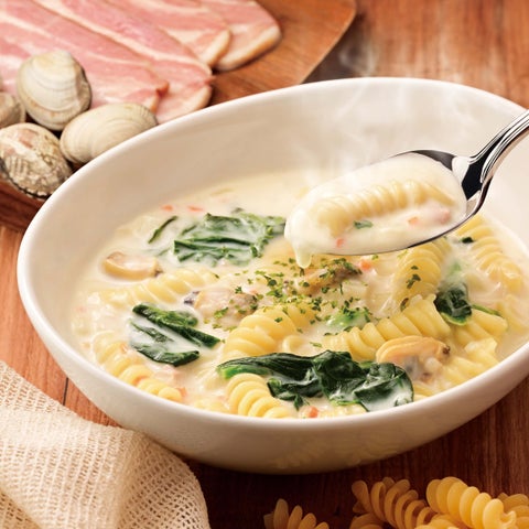 「寒い冬に心も体も温まる一品を届けたい」という想いから開発されたメニューです。玉ねぎやほうれん草など4種類の野菜を加え、じっくり煮込んだアサリの旨味が広がるクリーミーなスープに、ショートパスタ「フィジッリ」を合わせた具だくさんのスープパスタとなっています。今回初採用となるフィジッリは、コシのあるモチモチ食感が特徴で、らせん状の形状がスープにしっかりと絡み、コク深い味わいが口いっぱいに広がります。