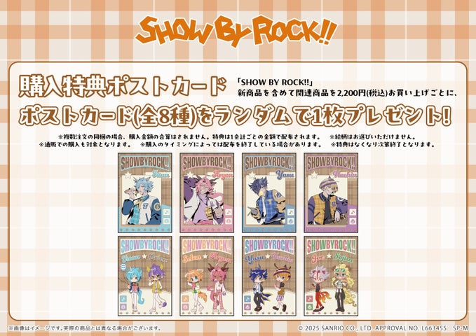 『SHOW BY ROCK!!』新商品を含め、関連商品を1会計につき2,200円(税込)お買い上げごとに、購入特典としてポストカード(全8種)がランダムで1枚プレゼントされます。ここでしか手に入らない限定品のため、ぜひコンプリートを目指してみてください。特典はなくなり次第終了となります。
