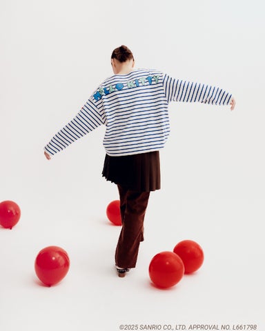 - バックスタイルに大胆に「HELLO KITTY」のロゴをプリントした、ゆったりとしたサイジングのボーダー柄カットソートップスです。左袖にはハローキティのワンポイント刺繍が施されています。身幅と袖幅にゆとりがあるため、抜け感のあるフェミニンなシルエットで着用いただけます。