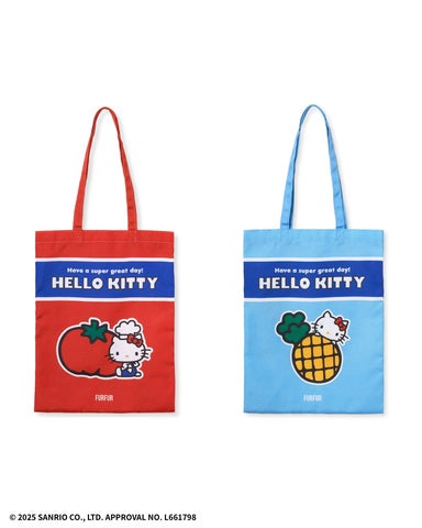 - ハローキティのトマト缶詰とパイナップル缶詰のデザインが大胆にプリントされたトートバッグです。A4サイズがすっぽり収まるサイズで、内ポケットも付いており、デイリーに使いやすいアイテムです。