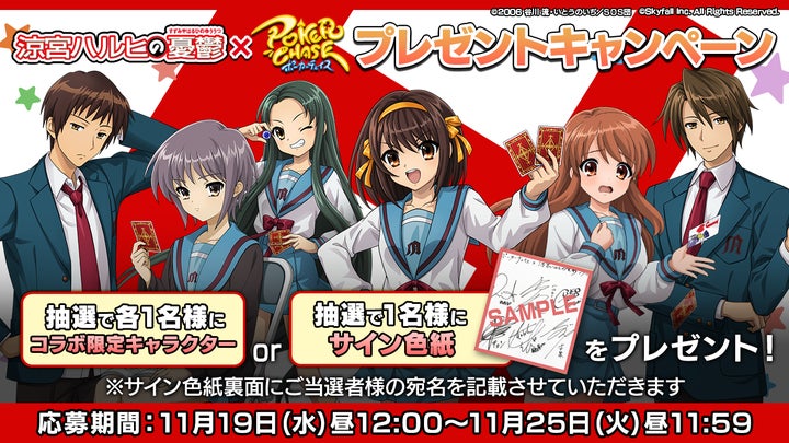 抽選で各1名様(計6名様)にTVアニメ「涼宮ハルヒの憂鬱」コラボキャラクターの『ポーカーチェイス』内プレイアブルキャラがプレゼントされます。さらに、抽選で1名様にコラボキャラクターを演じられたメインキャスト6名の寄せ書きサイン色紙がプレゼントされます。寄せ書きサイン色紙には裏面に当選者様の宛名が記載されます。