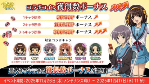 コラボキャラクターの所持種類数に応じて「コラボコイン【涼宮ハルヒの憂鬱】」の獲得数が増加します。- 1キャラ所持時:50%UPボーナス