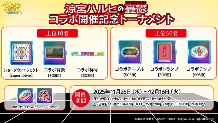 TVアニメ「涼宮ハルヒの憂鬱」コラボ開催を記念したトーナメントが実施されます。順位に応じてPCMや「コラボコイン【涼宮ハルヒの憂鬱】」を獲得できるほか、上位入賞者にはショーダウンエフェクト【super driver】、コラボ称号【SOS団】、コラボ背景【SOS団】、コラボテーブル【SOS団】、コラボトランプ【SOS団】、コラボチップ【SOS団】といった限定報酬が用意されています。