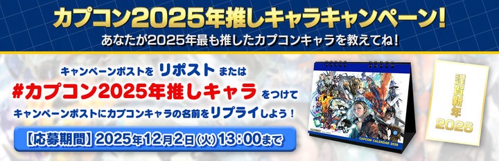 ハッシュタグ「#カプコン2025年推しキャラ」を付けて、2025年に最も推したカプコンキャラクターの名前をキャンペーン対象ポストにリプライ。 |