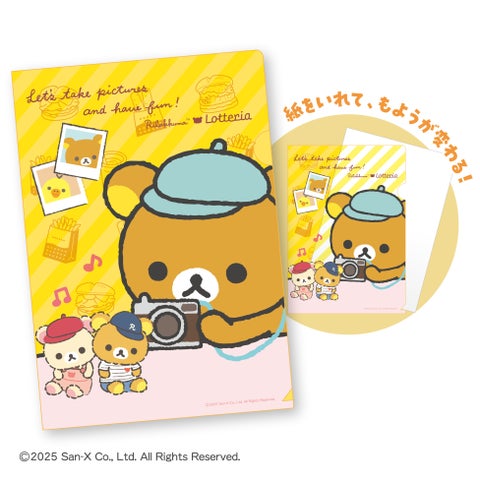 ぬいぐるみを撮影するカメラマン風のリラックマが描かれたクリアファイルです。中に紙などを入れると色や柄が透けて、ファイルの模様が変化するユニークな仕様が特徴です。