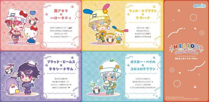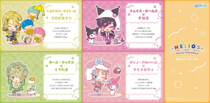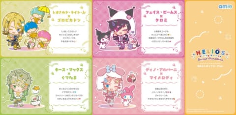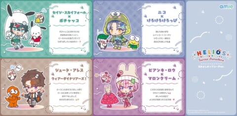 『HELIOS Rising Heroes×サンリオキャラクターズ』amie描き起こしミニキャラクターデザインを使用したアクリルスタンドが登場します。今回のコラボテーマである「なかよしポップコーデ」でかわいく着飾ったヒーローたちを、お部屋に飾って楽しむことが可能です。