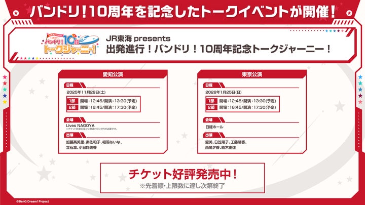 JR東海 presents 出発進行!バンドリ!10周年記念トークジャーニー!も、2025年11月29日(土)に愛知公演、2026年1月25日(日)に東京公演が開催され、チケットが好評発売中です。