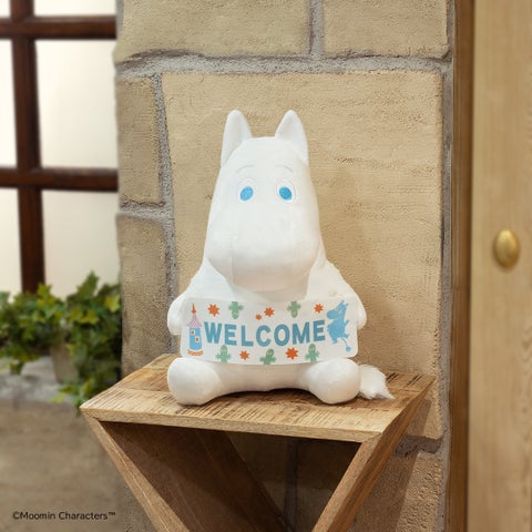 存在感のある約40cmのムーミンぬいぐるみ。ウェルカムボードを持ち、お部屋のインテリアとして優しい雰囲気をもたらします。
