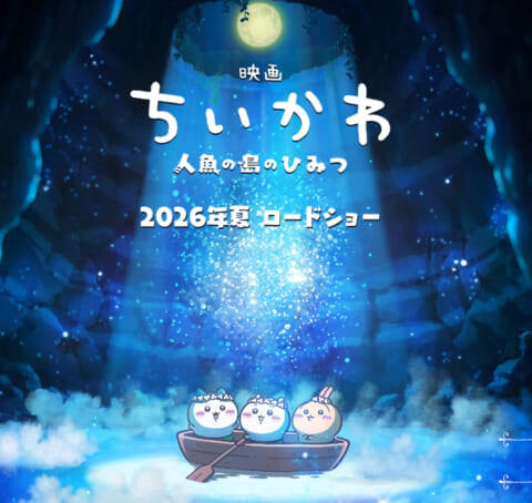 映画化が発表された「映画 ちいかわ 人魚の島のひみつ」は、原作のファンから高い人気を誇る「島編」を基にした物語です。メインビジュアルでは、青く輝く洞窟のような場所で、ボートに乗ったちいかわ、ハチワレ、うさぎの3匹が正面を向く姿が描かれており、新たな冒険への期待が高まります。