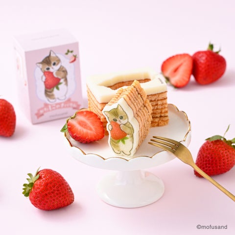 本商品は、もふもふのにゃんこたちがデザインされた、かわいさと遊び心、そして美味しさが融合したスイーツです。一番上のメレンゲ仕立ての生地にプリントされた絵柄を、切れ目に沿って「かた“にゃ”き」することで、もふもふのにゃんこがお皿の上に現れるユニークな体験ができます。型ぬきを通じて、食べる前のワクワク感も楽しめるのが大きな魅力です。
