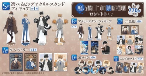 「鴨乃橋ロンの禁断推理 ロン&トトくじ」では、「探偵」と「猫の日」をテーマとした新規描き下ろしイラストが使用された、ファン必見のオリジナルグッズが多数用意されています。各賞全種のうち、いずれか1つが当たります。