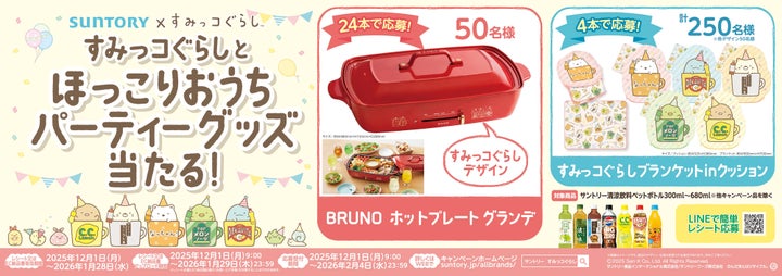 対象商品を購入し、所定の方法で応募することで、描き下ろしデザインの「すみっコぐらし」オリジナルホームパーティーグッズなどが当たるキャンペーンが実施されます。