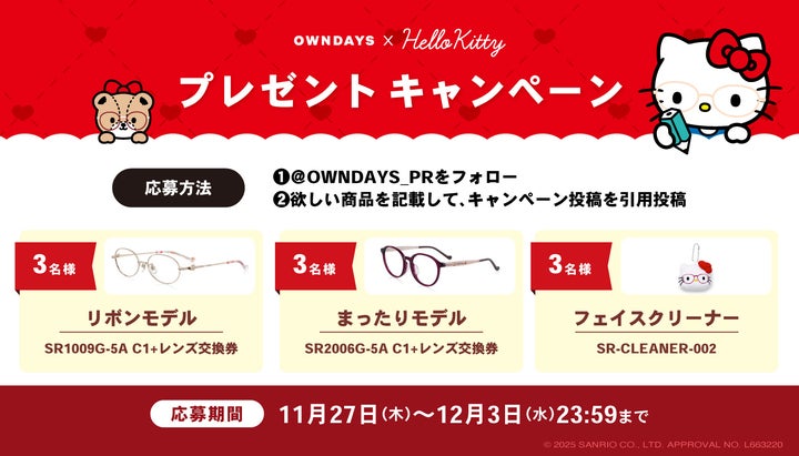 ハローキティとのコレクション発売を記念し、OWNDAYS公式Xにてプレゼントキャンペーンが開催されます。