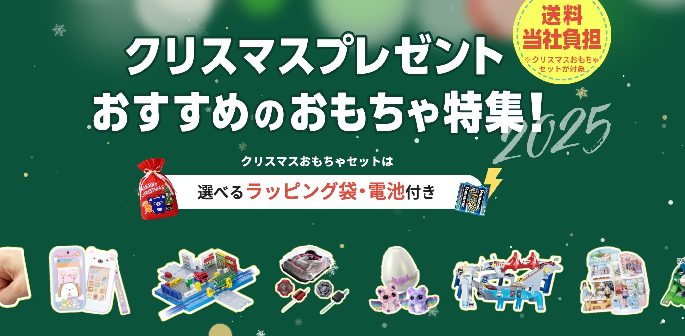 クリスマスおもちゃセットに選べるラッピング袋付属(数量限定)、電池同梱(一部商品)、初めての方向け最大200ポイントプレゼントのエントリーキャンペーン |