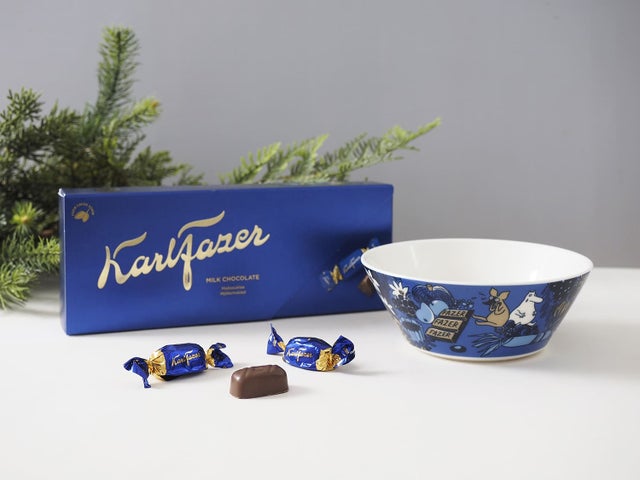 ムーミンの作者であるトーベ・ヤンソンとFazer社は、1937年からの深いつながりがあります。ムーミンの物語の第1作では、ムーミンたちがファッツェルの美味しいチョコレートを楽しむ姿が描かれており、時には食べすぎてしまうほど大好きな存在として登場します。この物語の場面の貴重な挿絵アートが、アラビア社に製造を依頼された本ボウルに採用されました。