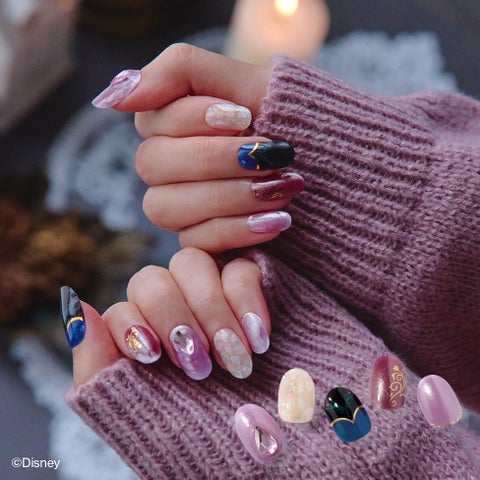 「エルサ」の戴冠式の衣装からインスピレーションを得たデザインは、落ち着いたベルベットのようなパープルと澄んだブルーが調和し、上品でクラシカルな雰囲気を醸し出します。「エルサ」の装飾品をモチーフにしたブルーのクリスタルカスタムパーツが、指先に唯一無二の存在感を放ちます。また、雪の結晶のモチーフは「エルサ」の魔法の力をイメージし、キラキラと輝くアートを完成させます。繊細に流れるマグネットグリッターが銀世界のようなミステリアスなムードを添え、ゴールドの箔が華やかさをプラス。特別な日にもふさわしい、高級感あふれるデザインです。