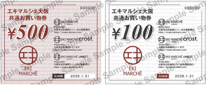 エキマルシェ大阪(crost・UMESTを含む)でのお買い物で、500円または100円分の共通お買い物券を獲得できます。このお買い物券は2026年1月31日まで使用可能です(一部対象外店舗あり)。