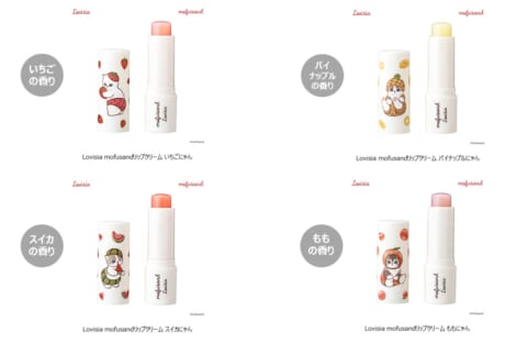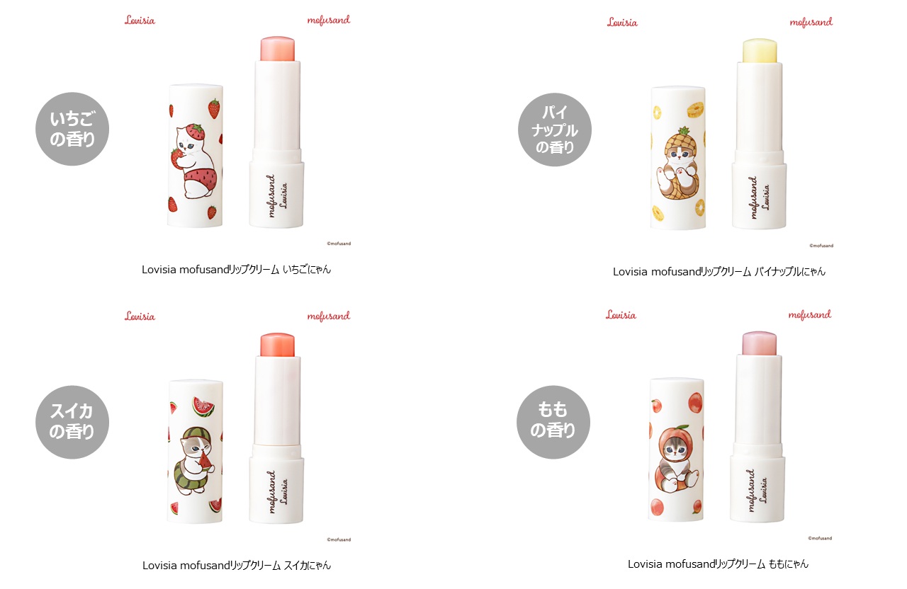 『Lovisia mofusandリップクリーム』は、いちご、パイナップル、スイカ、もものフルーツになりきったにゃんこたちの可愛いパッケージデザインが特徴です。みずみずしくなめらかな塗り心地で、唇の乾燥を防ぎます。