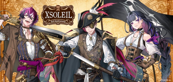 今回の3周年記念グッズでは、「XSOLEIL」のメンバーであるドッピオ ドロップサイト、狂蘭 メロコ、ヴェール ヴァーミリオンが“海賊 × スチームパンク”をテーマにした新たなビジュアルで登場します。レトロなコスチュームとクールな表情に注目です。
