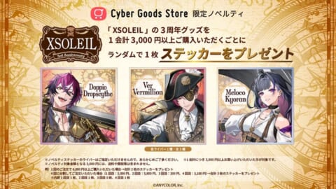 Cyber Goods Storeにて「XSOLEIL」3周年記念グッズを1会計3,000円以上購入すると、ランダムでステッカーを1枚プレゼントします(全3種)。