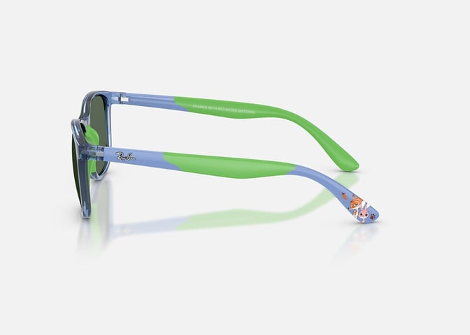 レイバン | ディズニー ズートピア2のキッズサングラスは、スポットライトを浴びるスタイルを演出します。透明感のあるブルーのバイオベースナイロンフレームに、鮮やかなグリーンのアクセントを組み合わせ、『ズートピア』の遊び心あふれる世界観を表現しました。テンプルにはバイオベース素材を使用し、快適な着け心地を実現します。