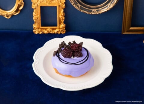 - ほむらをイメージした紫色のドーナツ。紫色のホイップクリームにココアビスケットやブラックベリーをトッピングしました。