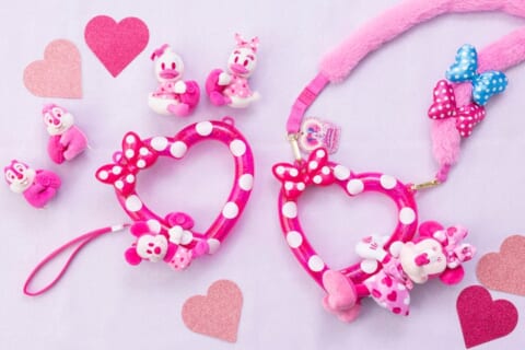 ミニーがハートのミラーを覗いたその先に広がるファンダーランドの世界をデザインしたポストカード、ステッカー、ピンバッジが登場します。また、ハートのアクセサリーやドット柄で彩られたエンターテインメントプログラム「ミニー@ファンダーランド」の衣装を身につけたぬいぐるみバッジも販売します。