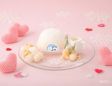 - かまくらをイメージしたムース入りかき氷の中で、ぴょんちーを思うすもっぴを表現したデザートです。ミルクソースをかけて、ヨーグルトアイスや白玉と一緒にお召し上がりください。