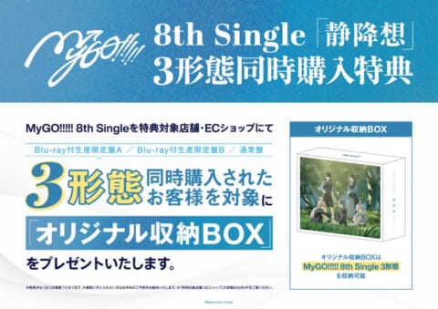 MyGO!!!!! 8th Single「静降想」の3形態(Blu-ray付生産限定盤A・Blu-ray付生産限定盤B・通常盤)を「特典配布対象店舗・ECショップ」にて同時購入されたお客様を対象に、「オリジナル収納BOX」をプレゼントします。