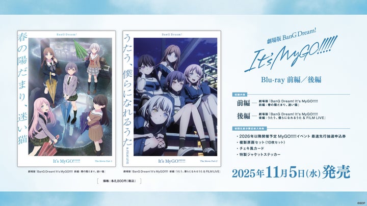 2024年9月に公開された劇場版「BanG Dream! It’s MyGO!!!!! 前編 : 春の陽だまり、迷い猫」と、同年11月に公開された劇場版「BanG Dream! It’s MyGO!!!!! 後編 : うたう、僕らになれるうた & FILM LIVE」のBlu-rayが、現在好評発売中です。