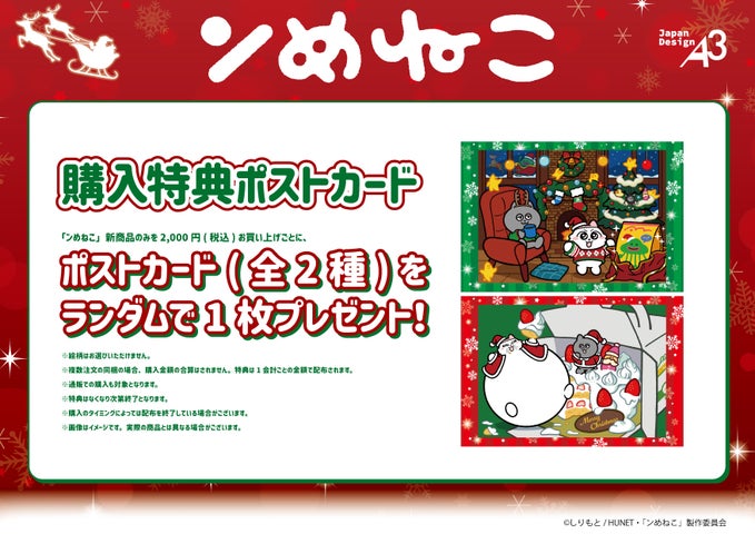 TVアニメ『ンめねこ』新商品のみを、1会計につき2,200円(税込)お買い上げごとに、ポストカード(全2種)をランダムで1枚プレゼントします。「暖炉ver.」と「ケーキver.」それぞれの描き下ろしイラストを使用した、限定デザインのポストカードです。
