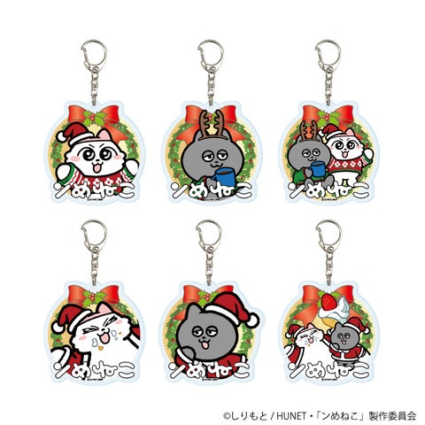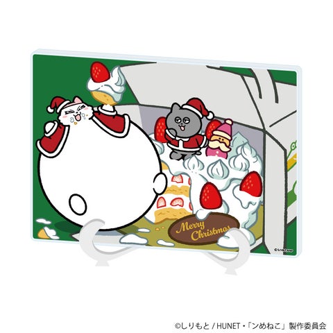 縦横最大15cmのアクリルスタンドです。毛糸のセーターやサンタ衣装に着替えた「ンめねこ」と「うすくろ」の全身姿を堪能できます。キュートなクリスマスケーキの台座にも注目です。