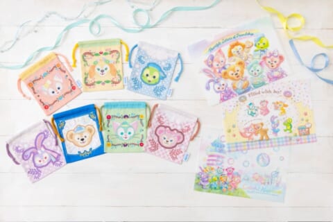 東京ディズニーシーに飾られている「ダッフィー&フレンズ20周年:カラフルハピネス」のデコレーションをイメージしたデザインのきんちゃくやクリアホルダーセットも登場します。きんちゃくは全部で7種類あり、どのデザインが出るかは袋を開けてからのお楽しみです。20周年の1年間の思い出をお友だちやご家族と振り返る機会にもなります。