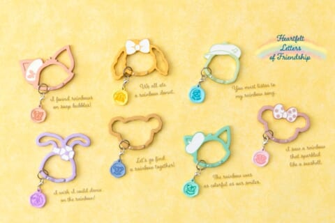 ダッフィー&フレンズ7人が虹のようにさまざまな色合いのコスチュームを身につけた、この企画ならではのデザインのぬいぐるみバッジが登場します。