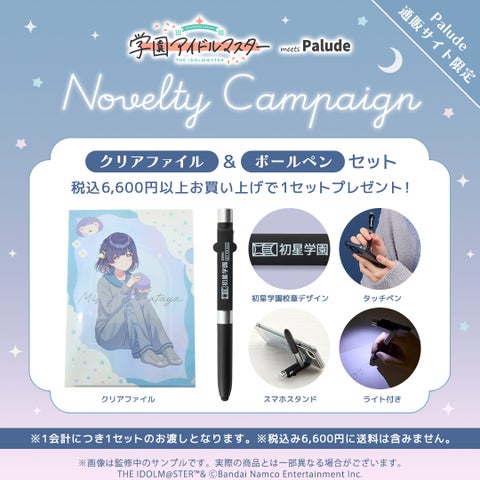 Palude公式通販サイトで「学園アイドルマスター」の商品を税込み6,600円以上お買い上げのお客様に、「クリアファイル&ボールペンセット」をプレゼントするキャンペーンを実施します。