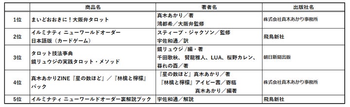 1位は書泉限定販売の『まいどおおきに!大阪弁タロット』が堂々のランクインです。質問してページを開くとユーモラスな「大阪弁」のメッセージを受け取れるだけでなく、タロットや大阪弁の一部を学べる大人気の占い本です。2位と5位の結果から、2025年は「予言」に注目した年であったと実感するような商品がランクインしています。3位には、発案者である鏡リュウジ先生を含む5名(計6名)による、6つの技法が収められた他にないタロット本です。4位も書泉限定販売の商品で、読んだ方の多くから共感された真木あかり氏とアイビー茜氏から勇気を得て前向きに生きられるZINEです。