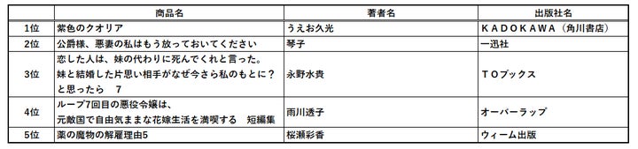 ラノベ・新文芸の1位は『紫色のクオリア』で、芳林堂書店との10冊限定復刊作品として大好評のうちに早期完売しました。2位の『公爵様、悪妻の私はもう放っておいてください』はコミカライズが好評で、原作書籍化の際には書き下ろしRシーンが増量され大人気となりました。