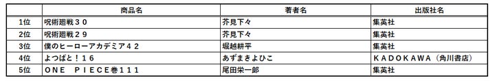 こちらは書籍の販売価格に関わらず、より多くの冊数が販売された書籍を対象としたランキングです。世界的にも大人気のコミック『呪術廻戦』『僕のヒーローアカデミア』のそれぞれ最終巻がランクインしています。