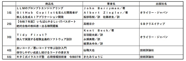 1位は話題の人工知能関連書籍『LLMのプロンプトエンジニアリング』です。他にも多くの人工知能関連書籍が出版されました。LLMは「大規模言語モデル(Large Language Models)」の略です。『改訂新版 良いコード/悪いコードで学ぶ設計入門』は著者の仙塲大也さんの選書フェアも好評でした。『Tidy First?』もコード改善とソフトウェア設計に関する書籍です。多くの方が受験する情報処理技術者試験の対策書籍も2位と5位にランクインしました。