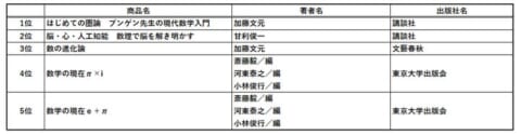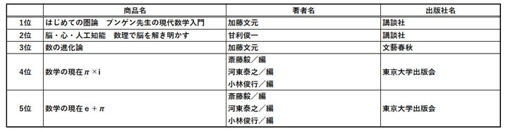 講談社ブルーバックスの加藤文元先生の『はじめての圏論』が、10月発売にもかかわらず堂々の1位を獲得しました。「ブルーバックスに圏論の本がなかった」という点も大きな反響を呼んでいます。2位は甘利俊一先生の、人工知能と人間の本質に迫る『脳・心・人工知能 増補版』です。昨年から引き続き、お二人の著書が1位と2位を独占する結果となりました。