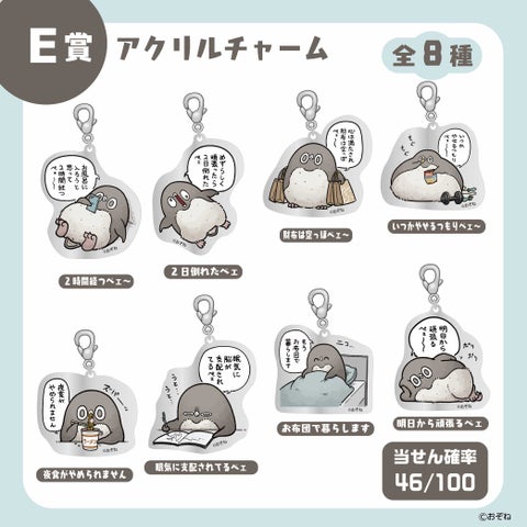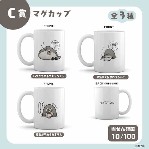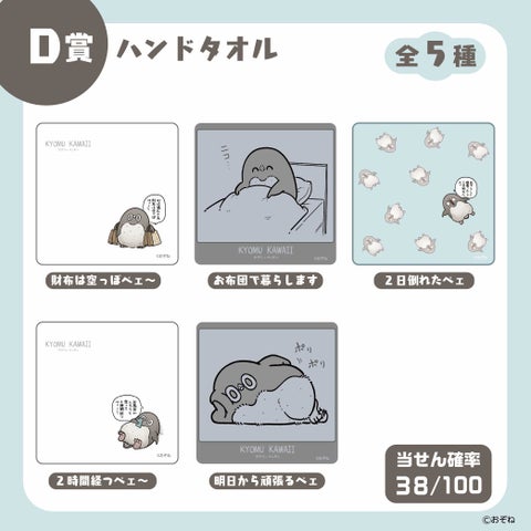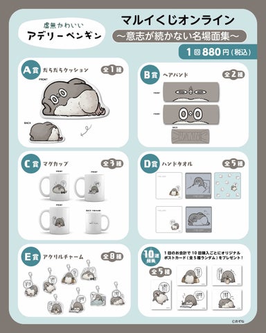 今回の「虚無かわいいアデリーペンギン マルイくじオンライン」では、クリエイターおぞねさんによる「意志が続かない」をテーマにしたイラストを使用した、ここでしか手に入らない限定グッズが登場します。各賞のラインナップを紹介します。