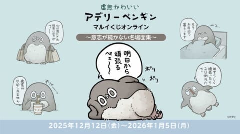 「虚無かわいいアデリーペンギン マルイくじオンライン〜意志が続かない名場面集〜」は、マルイウェブチャネルにて2025年12月12日(金)より開催します。この機会に、共感を呼ぶ“虚無かわいい”アデリーペンギンの世界を存分にお楽しみください。