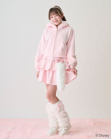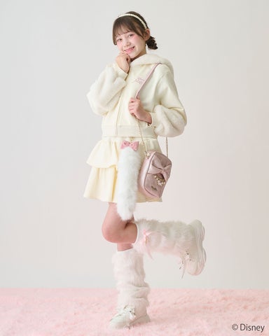 耳付きフードとぷっくりリボン、ティアードスカパン、ふわふわしっぽがセットになったアイテムです。しっぽは取り外し可能で、さまざまなアレンジを楽しめます。レッグウォーマーとのコーディネートが特におすすめで、お出かけで視線を独り占めするキュートなデザインです。